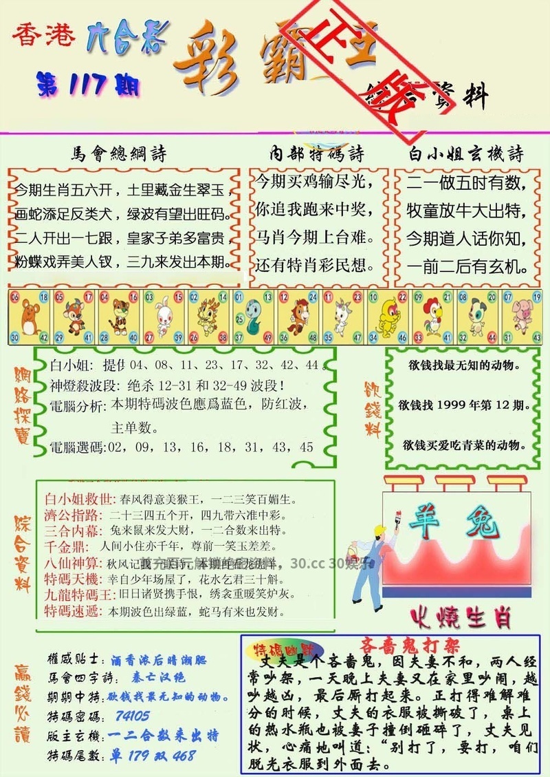 | 117期:单【牛蛇羊鸡】双【猴狗龙马】开:虎04错 |